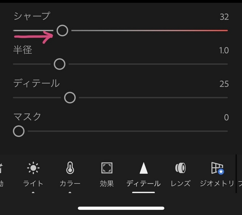 シャープの設定はノイズ除去から少し下にスクロールしたところにあります。